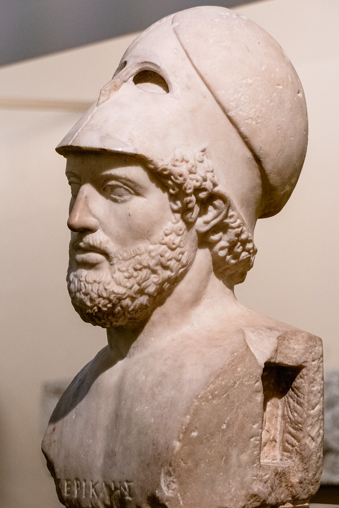 Pericles, pertenecía por parte de su padre, Jántipo, a la familia de los Buligios, mientras que por parte de su madre Agarista, sobrina de Clístenes, a la poderosa familia de los Alcmeónidas. Sus amigos, eran importantes pensadores y artistas, como Anaxágoras o Fidias. Adquirió una educación refinada, la cual le proporcionó una visión única del pensamiento de los ciudadanos de su época. Fue nombrado estrategos, que en ese momento era el cargo más importante de la ciudad, por más treinta años consecutivos, y por libre plebiscito, prueba de la confianza depositada en él por el pueblo ateniense. Se elegían diez estrategas, uno por cada phyle.